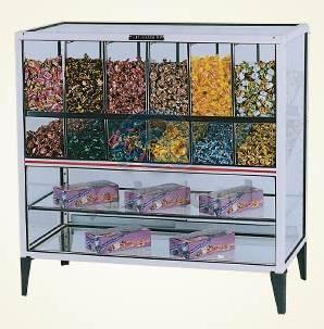 | Caramelera c/ Vitrina 18 Divisiones |  | 2 estantes regulables. Estructura de aluminio esmaltado color marfil. Totalmente de vidrio sobre burletes de goma. Estantes regulables con terminación ... |